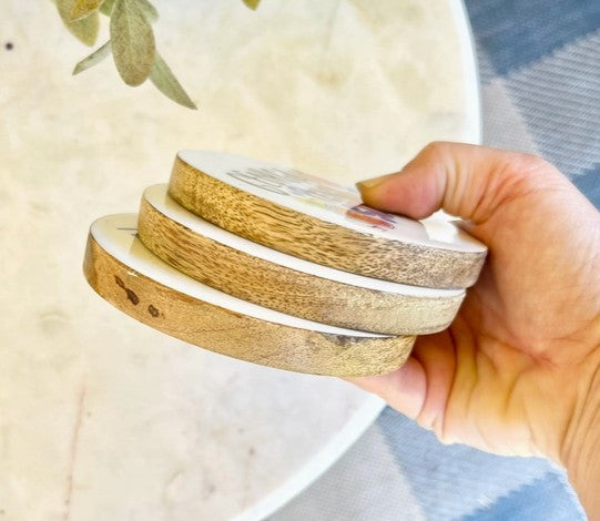 Measures 4". Each ornament showcases original hand painted artwork . Wood and Enamel.